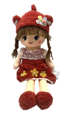 Кукла (мягкая) в терракотовой меховой шляпке и платье 45см / FLH-48