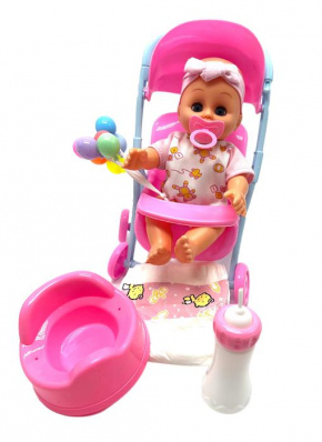 Кукла-пупс девочка в коляске с бутылкой, соской, аксес. 26*16см / сетка…