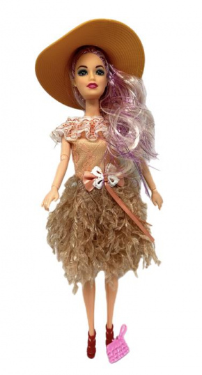 Кукла шарнир.руки в платье с бежевой бахромой + шляпка 32*11см /коробка…